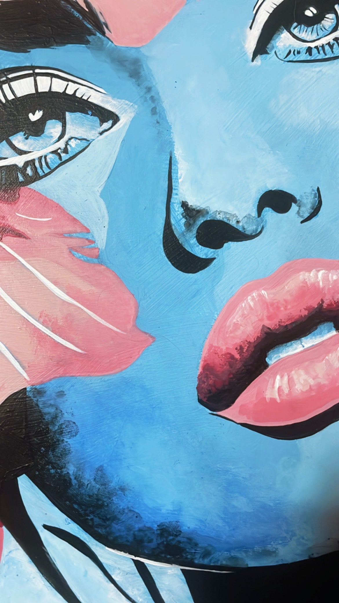This 16x16 circular canvas features a finger- painted portrait of a girl with flowers in her hair. Decorative, modern, and design focused- perfect as a statement piece for any space!