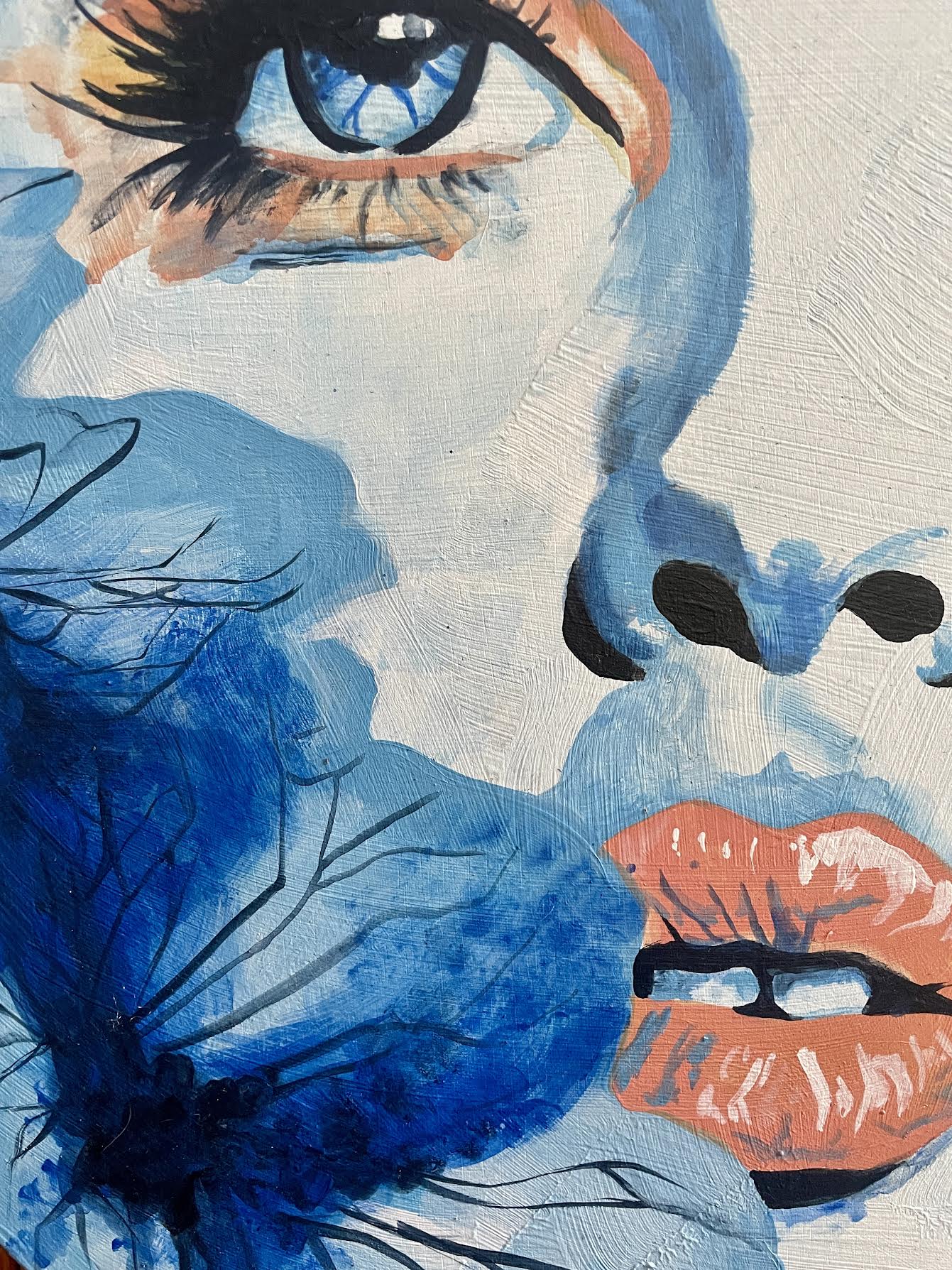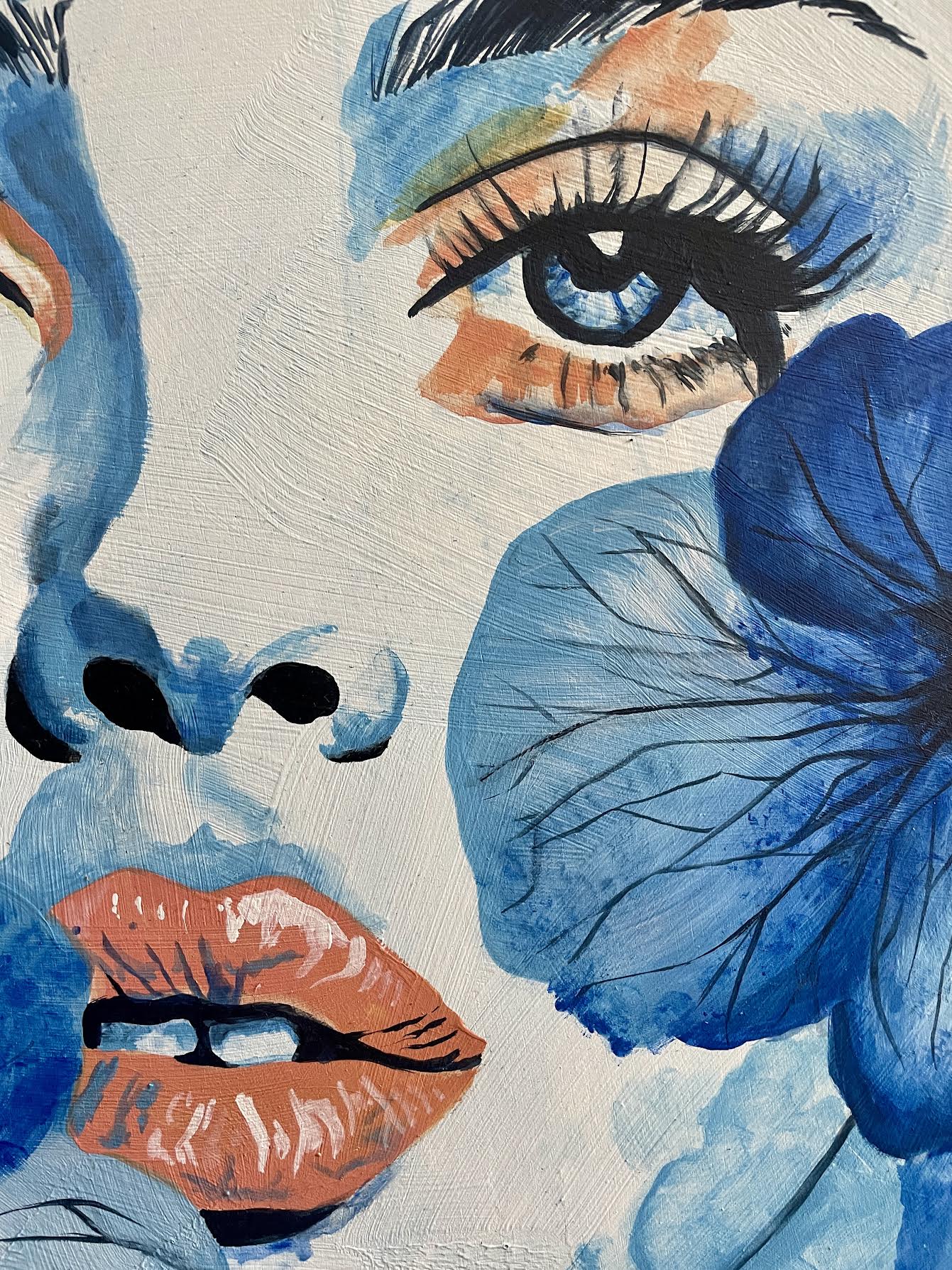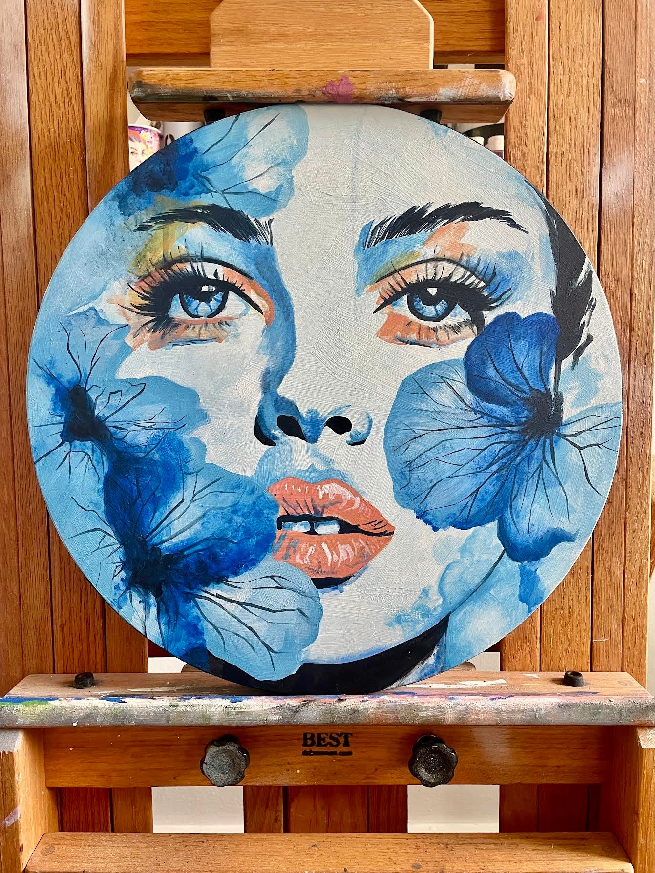 This 16x16 circular canvas features a finger- painted portrait of a girl with flowers in her hair. Decorative, modern, and design focused- perfect as a statement piece for any space!