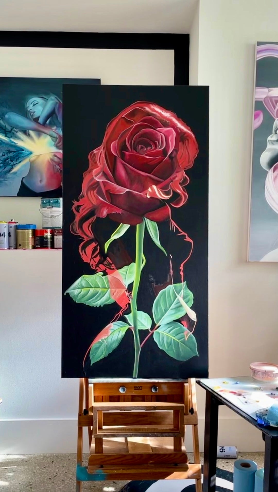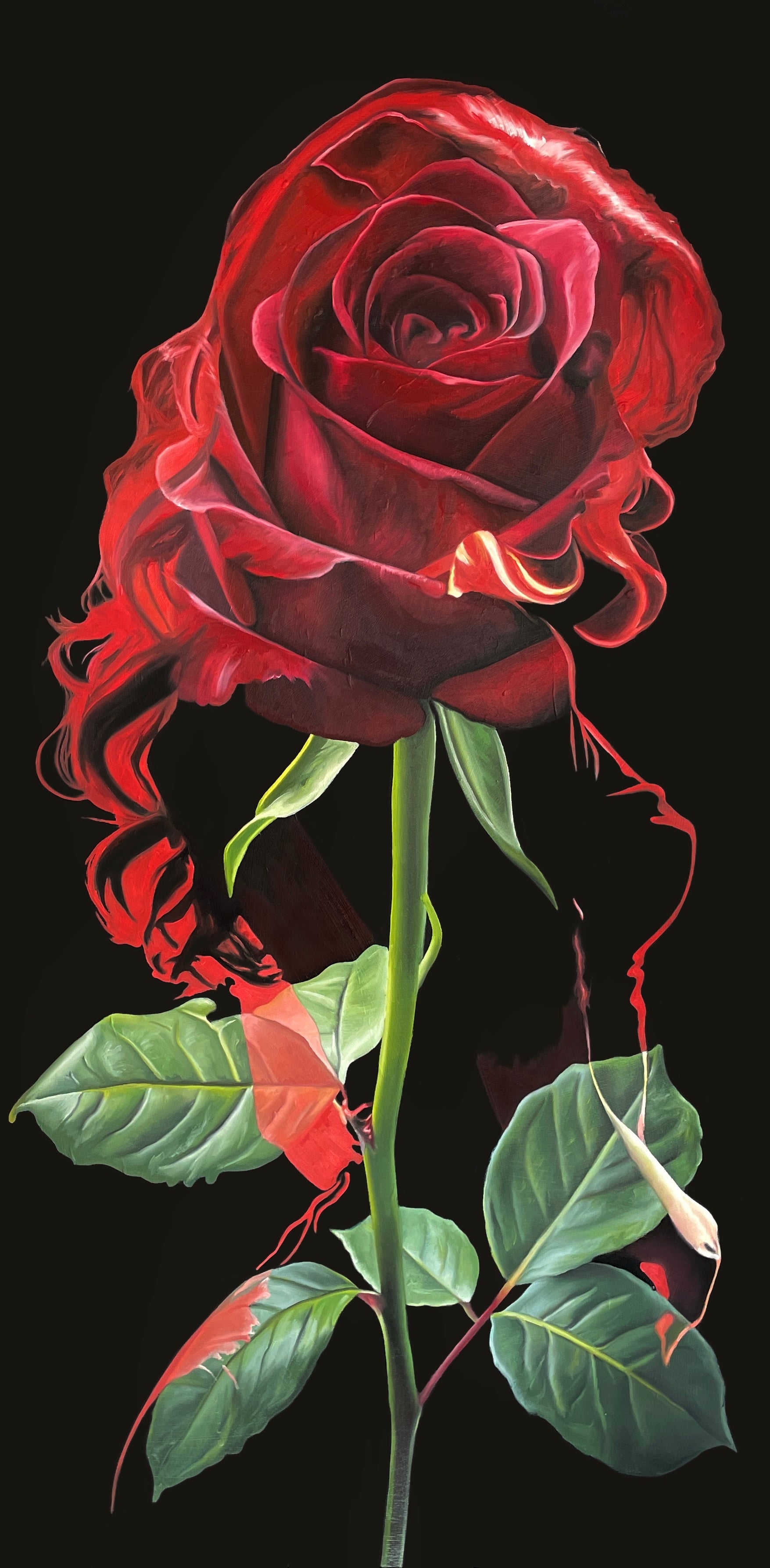 “Rose Lady,” a captivating painting by muralist Melanie Posner, explores the delicate interplay between beauty and vulnerability. This striking piece features a hyper-realistic red rose, partially unraveling into flowing strands of hair and abstract lines. The intricate details of the petals and leaves contrast against a deep black background, symbolizing the duality of strength and fragility. Through this fusion of portraiture and nature, Melanie invites viewers to reflect on the process of transformation, self-discovery, and the layers that make us whole.